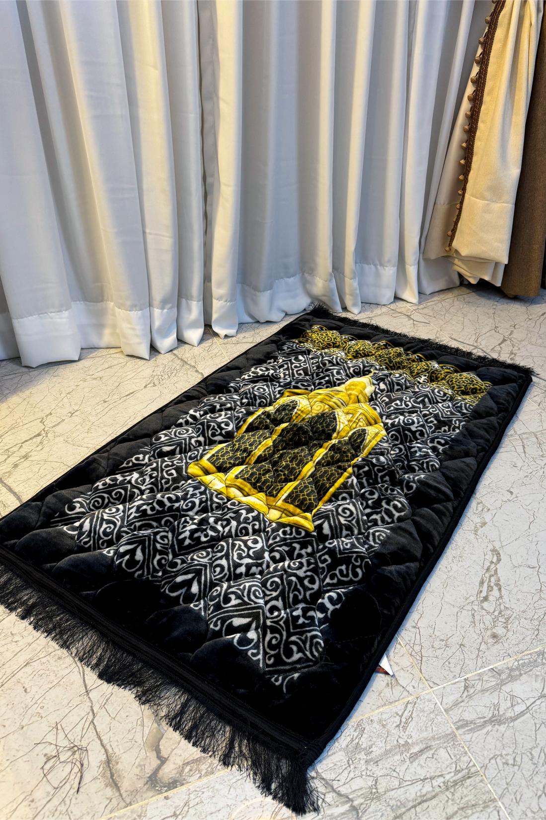 This black printed prayer mat provides a comfortable and hygienic surface for praying. Made from high-quality materials, it offers durability and easy maintenance. The elegant print adds a touch of style to your prayer space. Experience enhanced focus and peace during your prayers with this prayer mat.