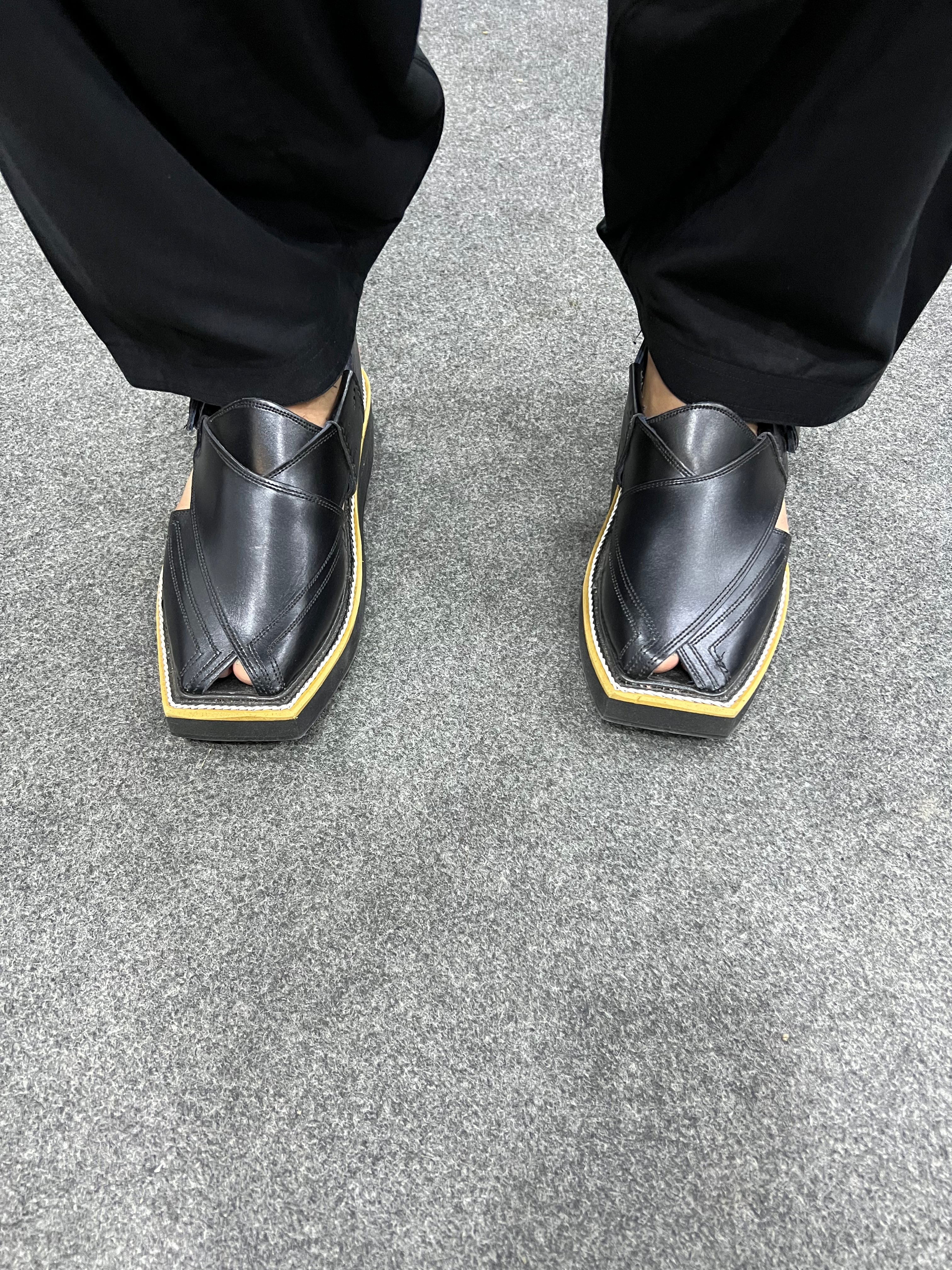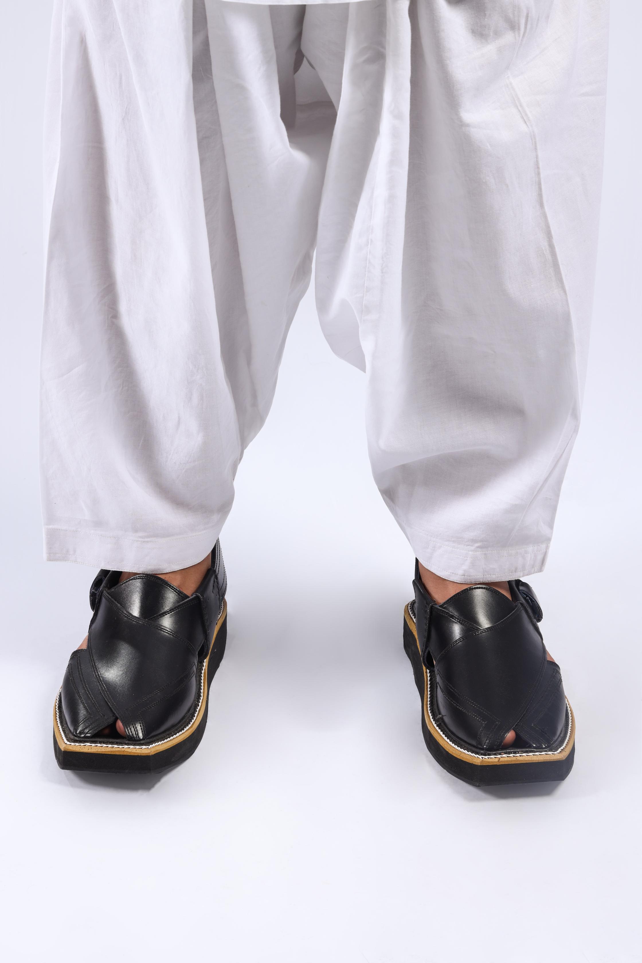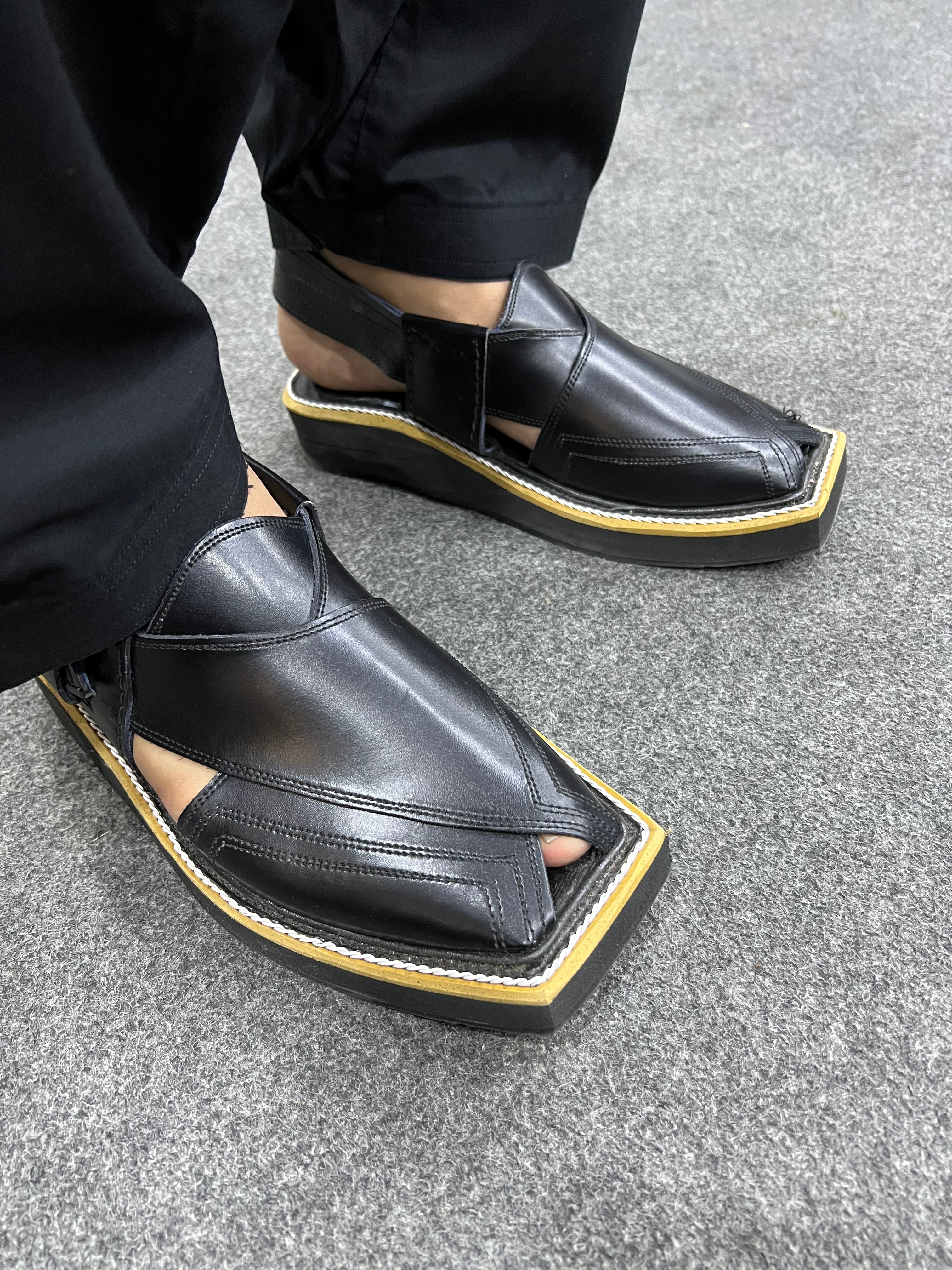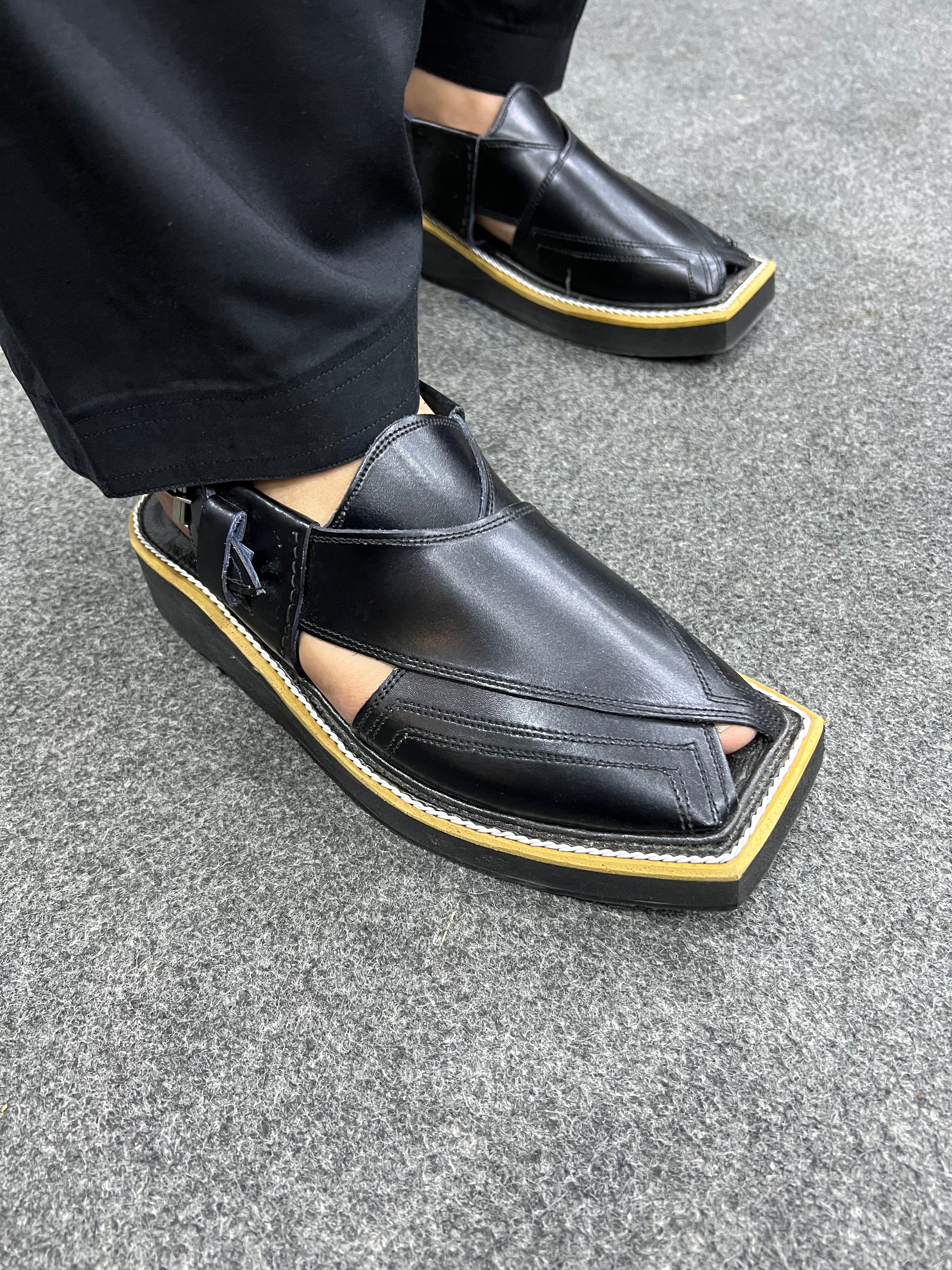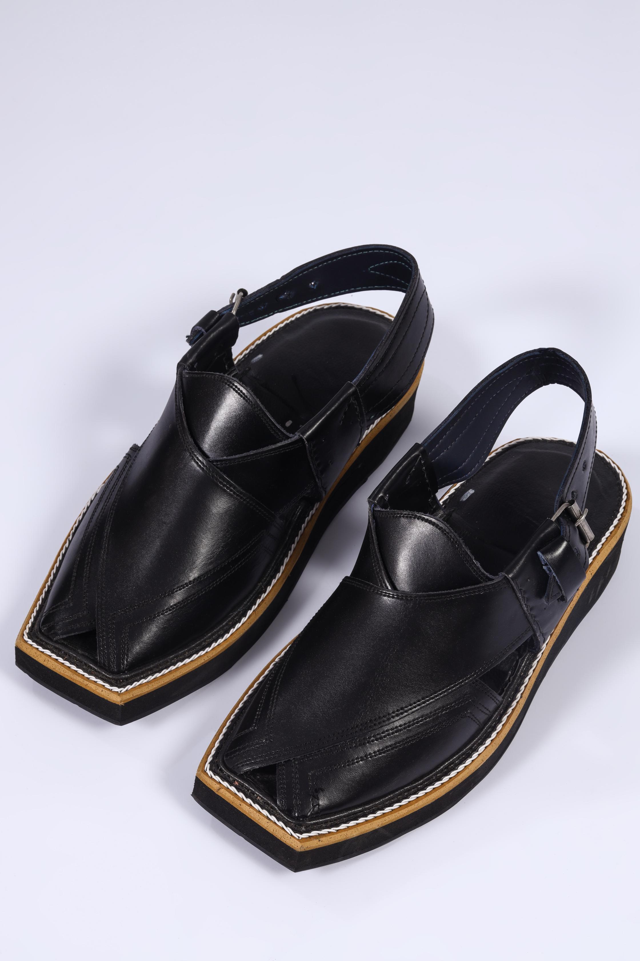 Crafted with precision, the KAPTAAN Black Peshawari Chappal combines traditional craftsmanship with contemporary elegance. This authentic footwear features premium leather construction, meticulous stitching, and a durable sole designed for exceptional comfort. The classic black finish ensures versatility, making it suitable for both formal occasions and everyday wear.