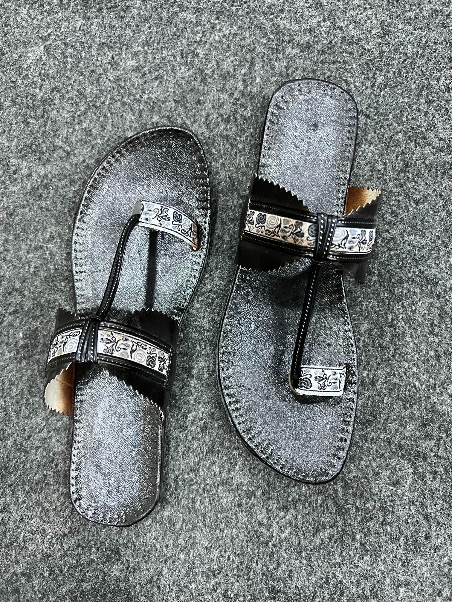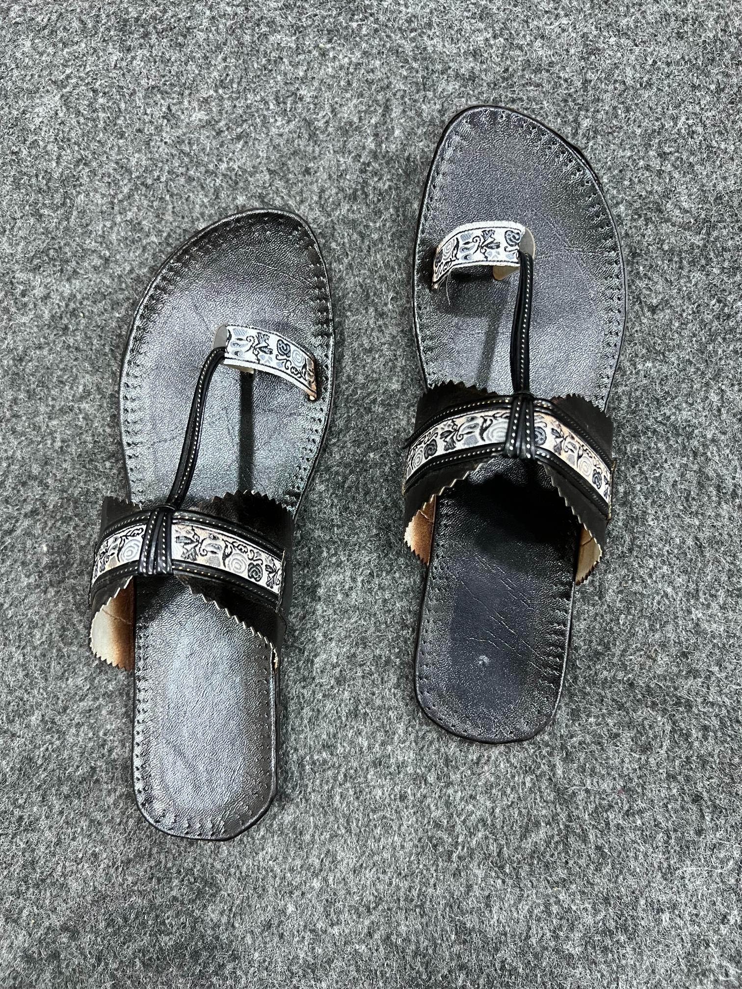 Expertly crafted using traditional techniques, the Mehr Black Kolapuri Chappal is a must-have for any woman. Made from quality leather and adorned with intricate details, this is not only stylish but also provide comfort and durability. Elevate any look with these handmade, one-of-a-kind kolapuri collection.