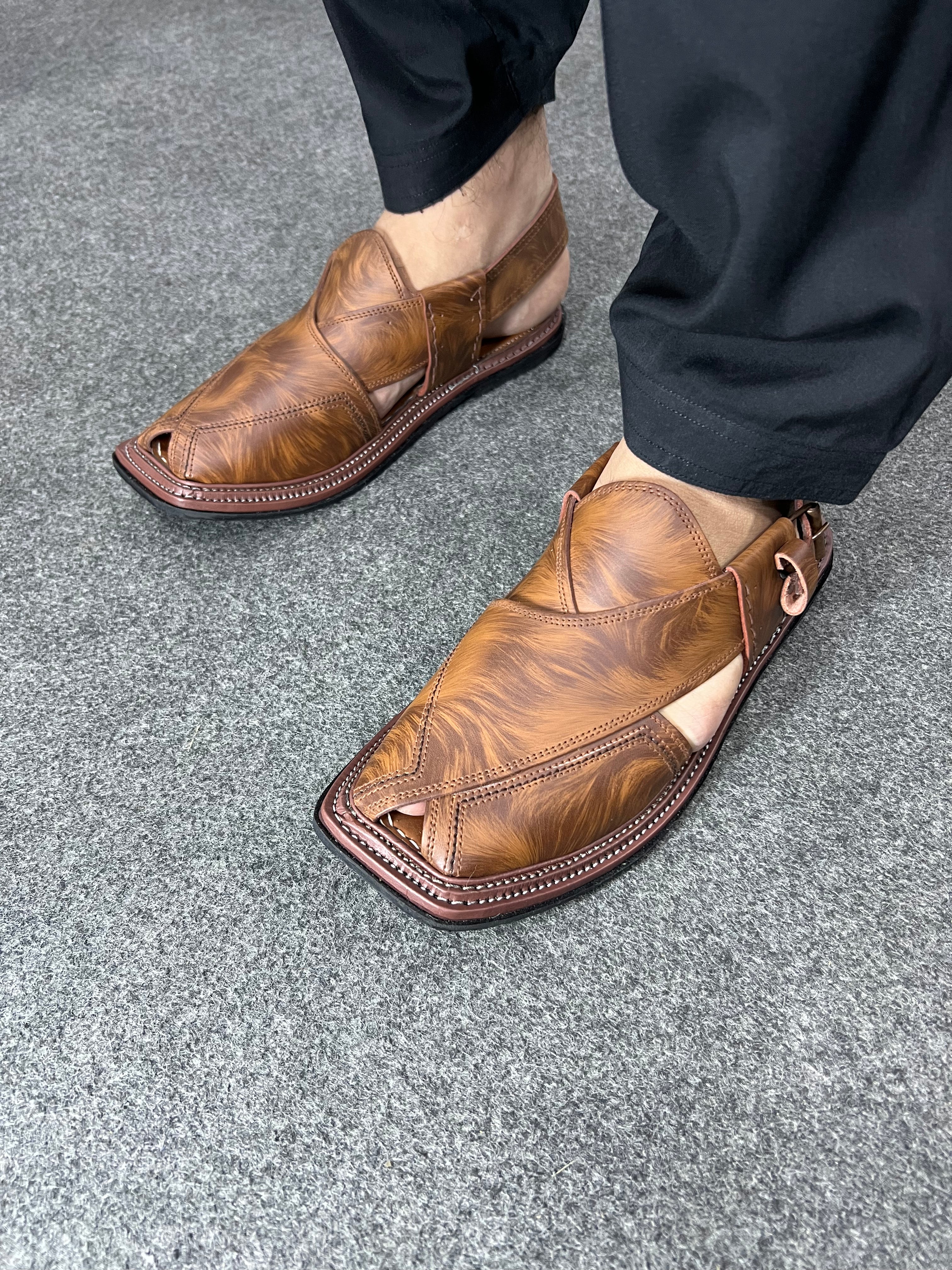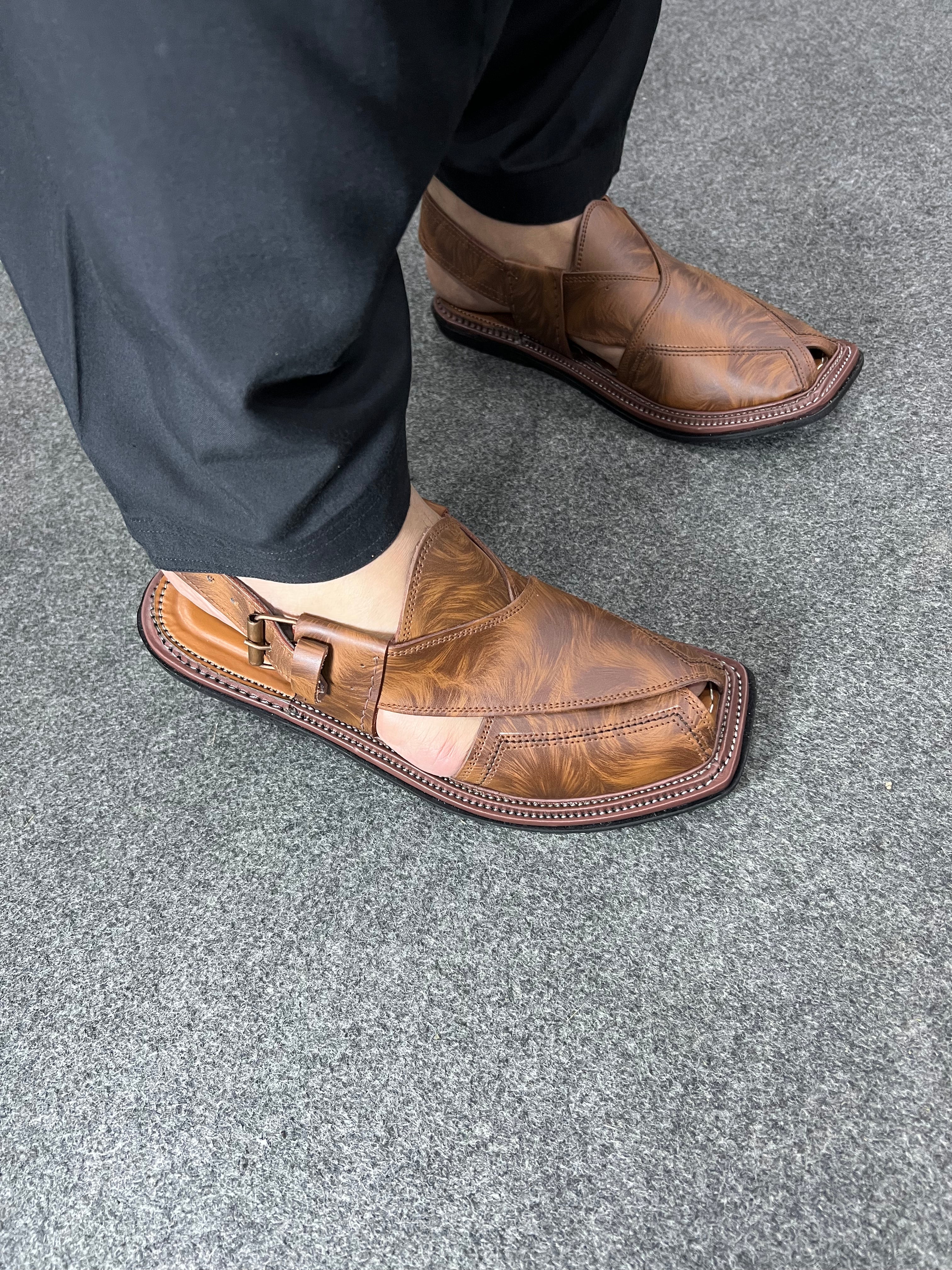 This distinctive Triple Gear Cheetah Print Peshawari Chappal merges traditional craftsmanship with bold contemporary styling. The striking cheetah pattern leather upper creates a sophisticated statement piece while maintaining authentic Peshawari construction. Engineered with the superior triple-gear sole technology, it delivers exceptional structural support, enhanced durability, and superior traction. Perfect for the discerning individual seeking to elevate formal or cultural attire with a distinctive aesthetic without compromising on the renowned comfort of traditional Pakistani footwear.